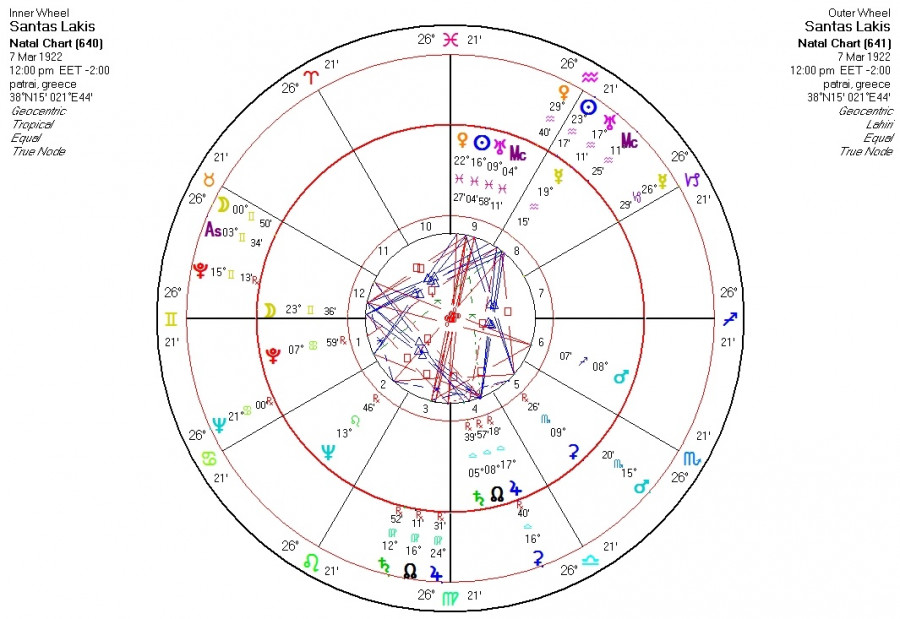 Γεννημένος στις 22 Φεβρουαρίου του 1922 (7 Μαρτίου με το νέο ημερολόγιο), είχε στο γενέθλιο ωροσκόπιο του μια πολύ χαρακτηριστική σύνοδο Ήλιου-Ουρανού, η οποία μάλιστα δεχόταν ένα τετράγωνο από τον Άρη στον Τοξότη. Μαχητής της γνώσης και της ηθικής ο τελευταίος, με «ειδίκευση» στους ξένους, είδε τους Γερμανούς και ...γυάλισε το μάτι του!