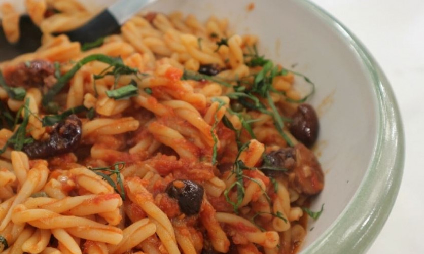 Πλεξούδες με κόκκινη σάλτσα, αντζούγιες και ελιές
