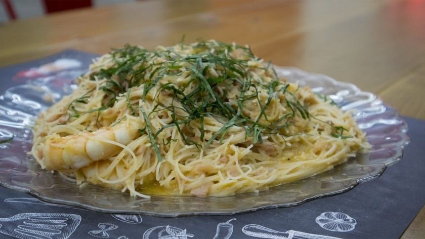 Συνταγή για rice noodles καρμπονάρα με γαρίδες από τον Γιώργο Τσούλη