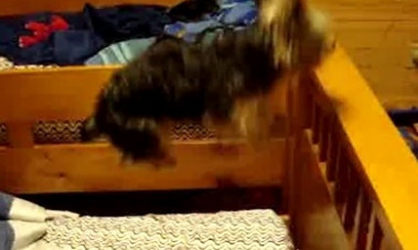 Ο σκυλάκος κάθε βράδυ, λίγο πριν την ώρα του ύπνου, τρελαίνεται να ανεβαίνει στο κρεβάτι και να πηδάει από το ένα στρώμα στο διπλανό, χωρίς σταματημό! Μάλλον οι ιδιοκτήτες του δεν θα πρέπει να του δίνουν λιχουδιές πριν την ώρα του ύπνου…